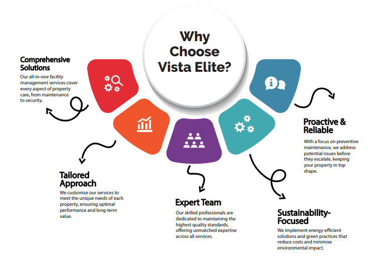 At Vista Elite, we are dedicated to transforming properties into high-performing, sustainable environments. Specialising in comprehensive facility management, we offer a wide range of services that prioritise safety, comfort, and operational efficiency. Our approach is built on a foundation of innovation and reliability. We empower property owners, developers, and managers with tailored solutions designed to extend the life of their assets. Whether it’s maintenance, cleaning, security, or landscaping, our services are designed to optimise every space, ensuring its functionality and value over time. We believe in creating environments that support the well-being of tenants while also delivering long-term benefits for property owners. Our commitment to sustainability ensures that every solution we provide not only meets the highest standards but also supports a greener future. At Vista Elite, we don’t just maintain buildings, we make them thrive. From preventive maintenance to proactive security, we provide the tools and expertise that turn every property into a safe, comfortable, and sustainable space for all.